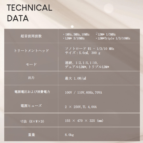 LDM水玉リフティング機器 LDM NOBLESSE ![]() 株式会社NBC TEL 092-714-5699 FAX 092-738-8832 mail info@nbc-japan.com 1・LDM NOBLESSE LDM NOBLESSEは、 ドイツのWellcomet社が開発した最新の超音波美容機器です。 高度な専門知識と先進的な技術を基に設計され、10MHzという高周波の超音波を採用しています。 この技術により、肌の深部にまで働きかけ、効率的な施術が可能です。 さらに、物理療法機器で用いられる干渉波技術を応用しており、肌の構造にアプローチすることで、健やかな肌環境をサポートします。 また、LDM®(ローカルダイナミックマイクロマッサージ)技術による超音波の微細な振動が、肌を整えながら心地よい体験を提供します。 これらの機能により、施術を受けるお客様にさらなる満足を提供し、快適な施術環境を実現します。。 2・10MHzの特徴 1MHzの超音波振幅は0.018μm です。 細胞の大きさ10μmよりは小さ いですが、細胞膜の厚さ0.005μmよりは大きいです。 対して、10MHzは0.0018μmと、細胞膜の厚さ0.005μmよりさらに小さく、この従来超音波では与えられなかった微細振動によて、これまでに無い効果が期待きす。 ![]() 3・HSP (Heat Shock Proteins)とは ◇人体の免疫システムを稼働(全ての生物に存在 全ての生物に存在 ) ◇熱刺激など外部のにより発現、再生促進 熱刺激など外部のにより発現、再生促進 ◇細胞やコラーゲン等の物質 が正常に生成されるため必要なタンパク質 ![]() ≪様々な US の周波数とHSPの発現と関係を確認≫ 培養されたヒト骨髄性白血病細胞(human promyelocyticpromyelocytic leukemia cells、HL -60 細胞 )における体外実験 ![]() 4・GAG (Glycosaminoglycans)とは ◇細胞外マトリックスの物理的な弾性を担う、繰返し構造持つ多糖類大きい複合体です。 ◇多くの枝を持ち、親水性で粘高い液体として存在するためムコ糖ともいいます。 ◇乾燥時は真皮内のわずか0 .1〜0.2%の重量ですが、自分の重さの1000倍にあたる多量の水分を含むことができる性質持ちます。 ![]() ≪GAG の偏り解消≫ 老化や、表情によるしわ(表情筋のパターン化した動き)などの継続した圧力などにより、 GAG 分布に偏りが生じるようなります。 その結果、GAG が少ない部分では、組織の水分含有量が少なくり、皮膚組織の中内部圧力は減少し、 慢性的なくぼみ (= しわ )となっていきます 。 LDM NOBLESSEによって与えられる組織 への高速かつ微細な振動は、 胞間の物質の粘性を下げ流れ作り、 GAGを均等にならしてくれます。 LDM NOBLESSE施術後、細胞間の隔が大きくなり皮膚組織はとても柔らかい状態になります。 こうした状態は、肌に対する様々な施術の助けとなります。 ![]() 5・LDM NOBLESSE : 生成 と消滅 のバランス こうしたデータを元に、超音波の様々なパラメ調節組み合わせることで、生成分解のバランスを活性の高い状態で整えます。 ![]() テク・データ ![]() LDM水玉リフティング機器 LDM NOBLESSE ![]() 株式会社NBC TEL 092-714-5699 FAX 092-738-8832 mail info@nbc-japan.com ページの先頭へ戻る |